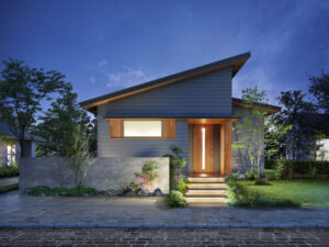 外観は伸びやかな片流れ屋根にシャープな玄関庇を組み合わせたスタイリッシュな外観。軒天や柱に用いた木の質感が建物に彩りを与えます。