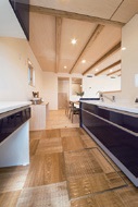 キッチンで気になるのは床の傷や汚れ。桧も水に強く、マメなお手入れでカバーできますが、より傷が付きにくい強い木材やタイル、クッションフロア等に変えると、油ハネや水の染みを防ぎ、キレイな床を保つことができます。