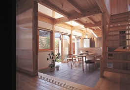 玄関を入ってすぐの土間に設けたセパレートキッチンとダイニング。キッチンが主役になる大胆な配置です。無垢の木とステンレス、床のタイルの組み合わせが印象的な空間。収納の工夫やマメな清掃は必要ですが、お店のようなスタイリッシュな空間を作れます。