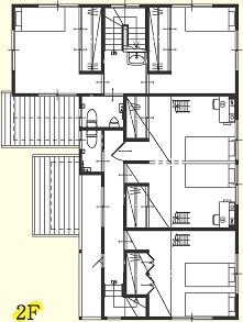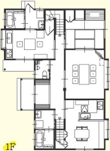 リビング全体が見える間取り図。吹き抜けと階段が家族の生活動線の中心になっています。