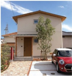 玄関アプローチから見た外観。洋風でありながら和のエッセンスを感じさせる外壁色が、周囲の緑と調和して見えます。