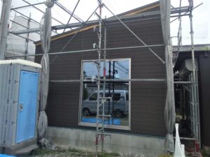 上棟完了、外部敷地いっぱいです。片流れ屋根